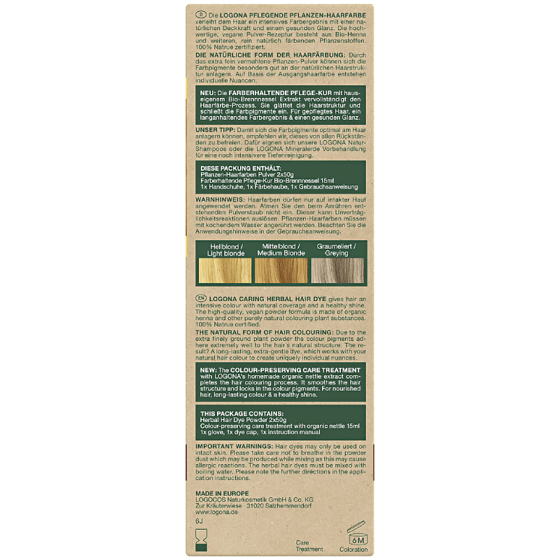 LOGONA BILJNA BOJA ZA KOSU poseduje Natrue sertifikat i napravljena je od prirodnih sastojaka. Zahvaljujući ekstra fino mlevenom biljnom prahu, pigmenti boje izuzetno dobro prijanjaju na prirodnu strukturu vlasi. Pre samog postupka operite kosu prirodnim šamponom bez silikona. Logona tečni šamponi su idealni za to jer su u potpunosti bez slikona, sulfata i parabena. Za dubinsko čišćenje preporučujemo Logona Lavaerde glinu za čišćenje. Oslobađa kosu od tvrdokorne peruti i ostataka proizvoda.